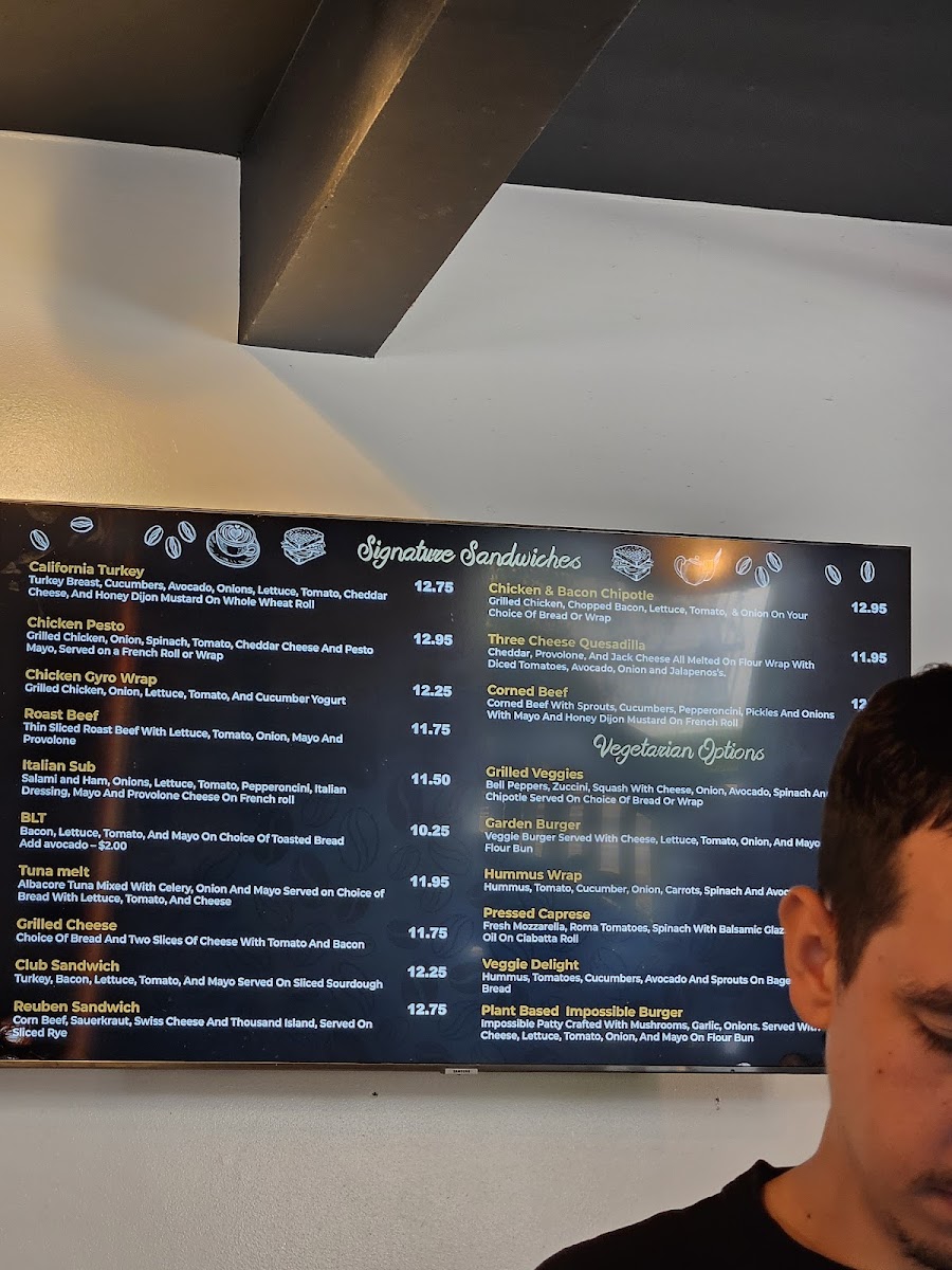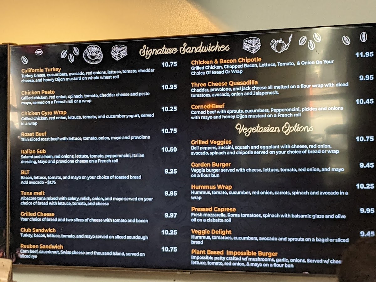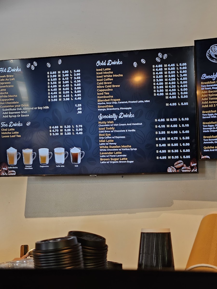 The menu is designed to accommodate quick orders or casual dining experiences, with options that appeal to customers seeking coffee breaks, breakfast, or light lunch dishes. Outdoor and indoor seating make it convenient for visitors looking to enjoy meals or beverages in a relaxed setting.