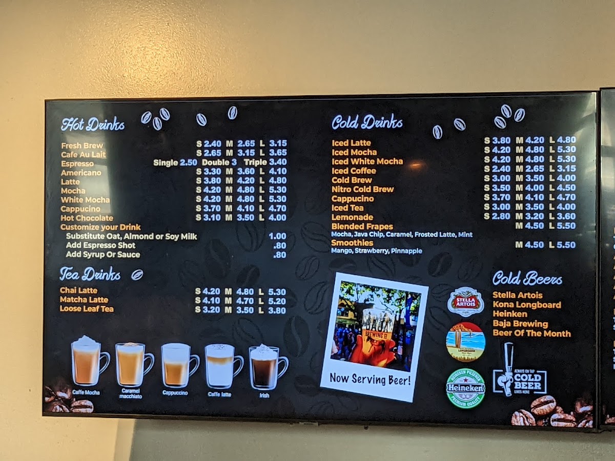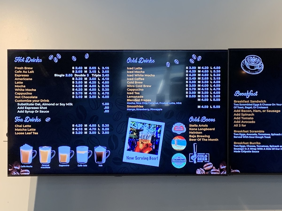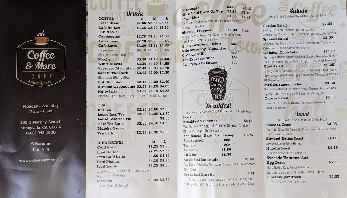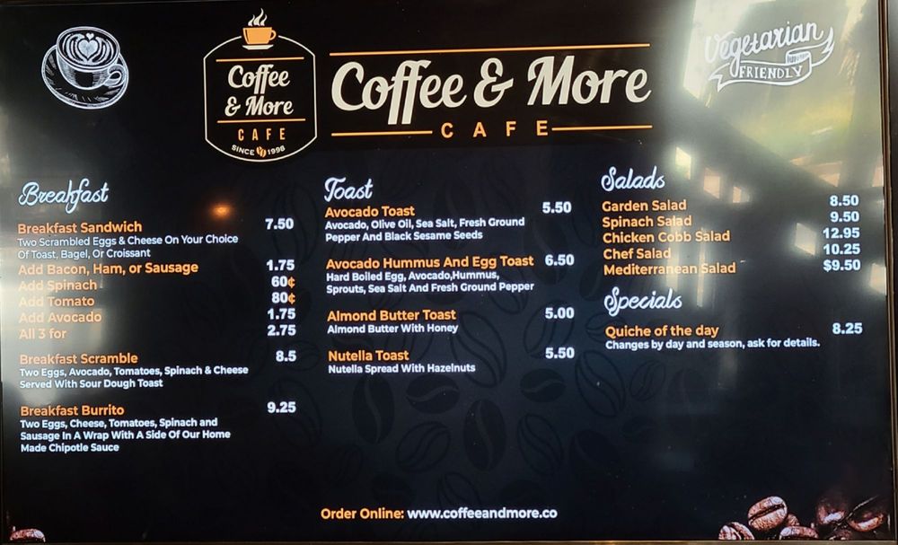 The menu is designed to accommodate quick orders or casual dining experiences, with options that appeal to customers seeking coffee breaks, breakfast, or light lunch dishes. Outdoor and indoor seating make it convenient for visitors looking to enjoy meals or beverages in a relaxed setting.
