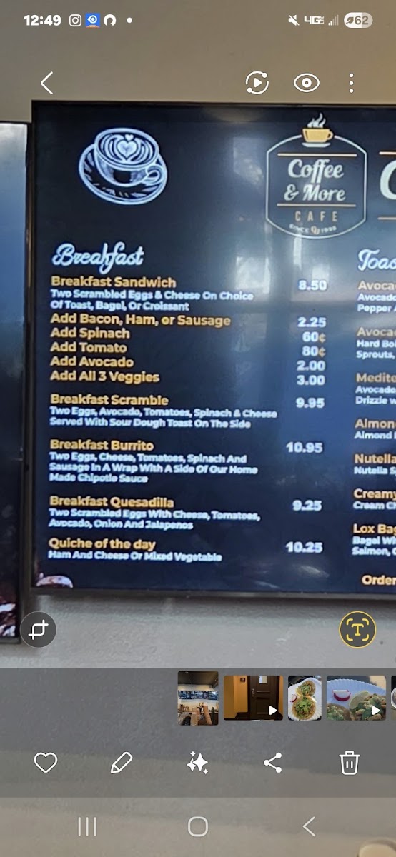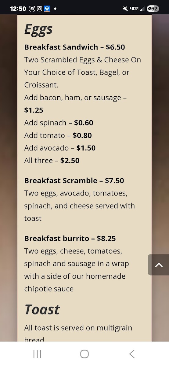 Sandwiches and Light Meals: The menu includes items like Chicken Bacon Chipotle Sandwich, Caprese Sandwich with fruit, and the Breakfast Burrito with fruit. Additionally, there are breakfast-focused dishes like Avocado Toast, Breakfast Scramble, and Egg Bagels, suitable for morning or mid-day dining.